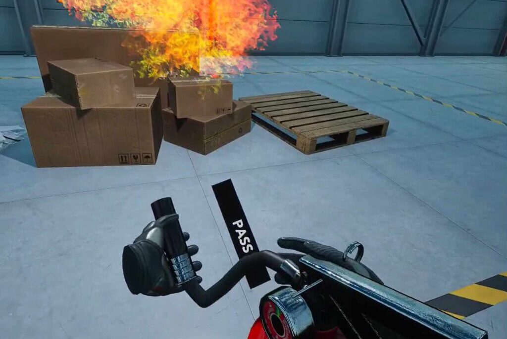 To enhance realism, the system supports both standard VR controllers and a custom extinguisher-style physical prop, increasing tactile engagement and retention.